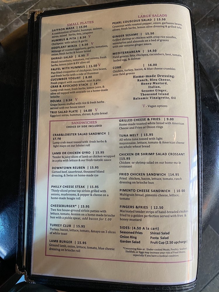 Saffron Restaurant in Charleston, SC, offers a diverse menu with options for breakfast, brunch, lunch, dinner, and dessert. The on-site bakery is a standout feature, with a wide variety of cakes, cheesecakes, tarts, cookies, and pastries. Customer reviews praise the pastry selection, with John F. noting reasonable prices and good food quality. Cat T. raved about the tiramisu and chocolate praline cheesecake, highlighting the lightness and decadence of the desserts. The restaurant also serves fine Mediterranean cuisine, with dishes like lamb gyro and Cornish hen kabob receiving high praise from Swaraj K. Prices are reasonable, service is great, and the atmosphere is casual. Saffron Restaurant is a must-visit for those looking for delicious pastries and flavorful Mediterranean fare in Charleston.